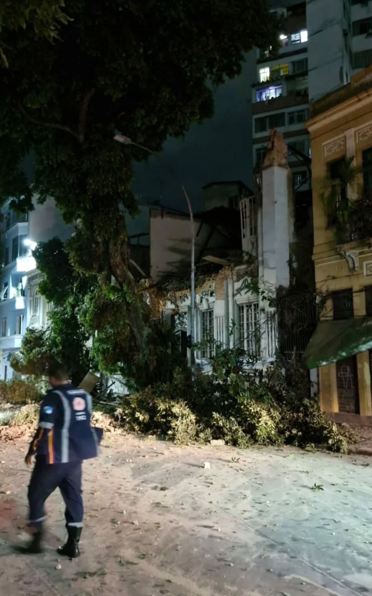 Equipes da Companhia Municipal de Limpeza Urbana foram acionadas para remover os escombros e cortar uma árvore atingida pelo desabamento, que tombou sobre parte da calçada e da via.
