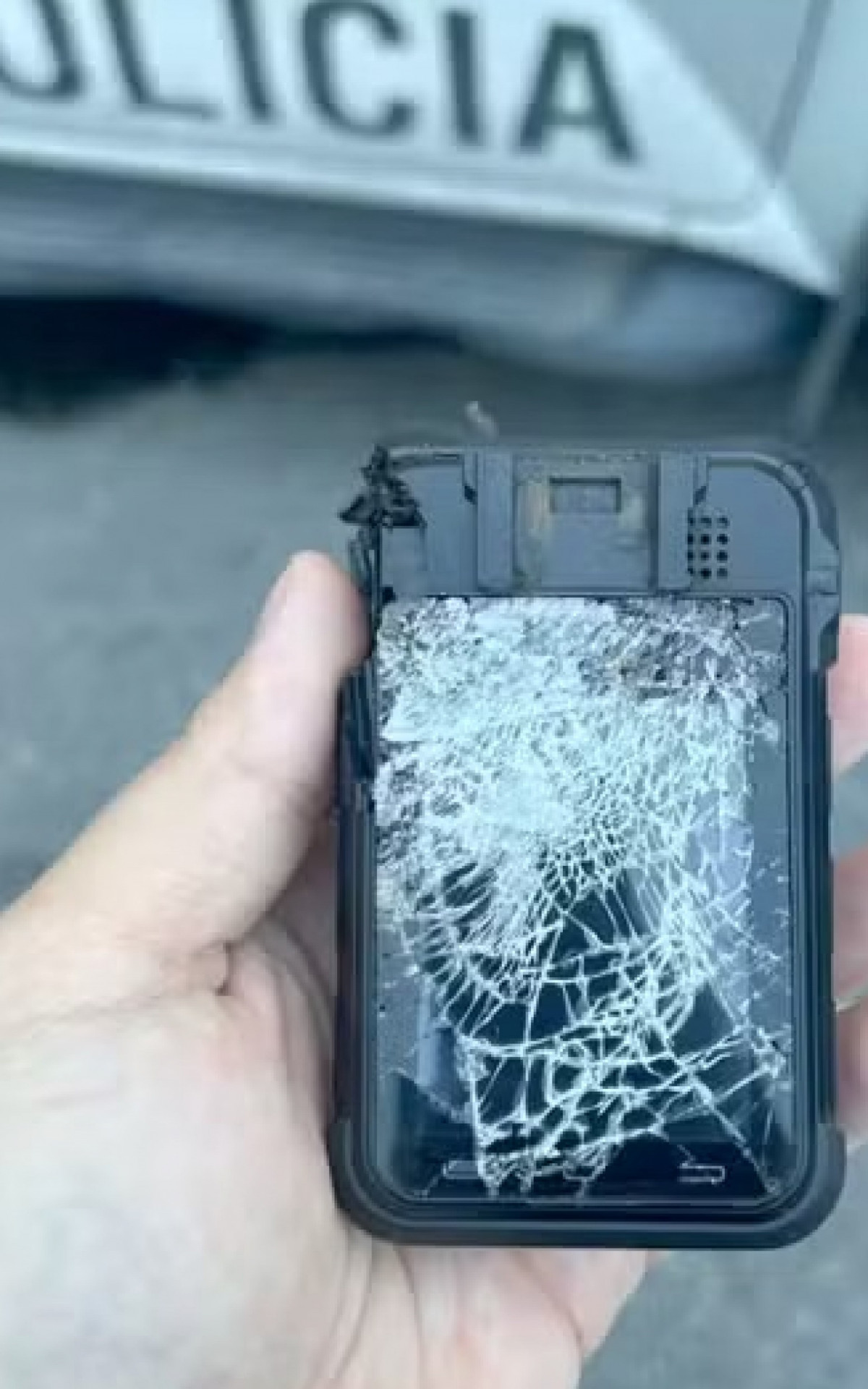 Na ocasião, o disparou atravessou para-brisa da viatura e atingiu o equipamento preso ao uniforme do agente, que sofreu ferimentos por estilhaços. Em imagens é possível ver o estrago feito no aparelho e marcas no carro usado pelos militares.