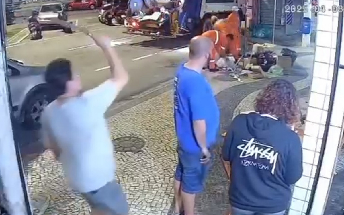 Na imagem, registrada por uma câmera de segurança, é possível ver um homem de camisa azul parado na calçada do estabelecimento, acompanhado de uma mulher, quando o agressor, que não teve a identidade revelada, se aproxima e o ataca na altura do pescoço.