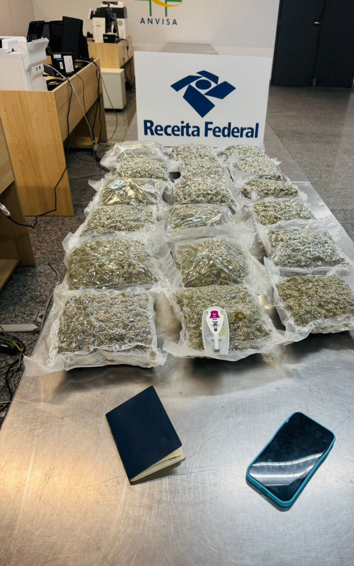 O viajante, um brasileiro de 27 anos, e a substância foram encaminhados à Polícia Federal. Ele responderá pelo crime de tráfico internacional de drogas.
