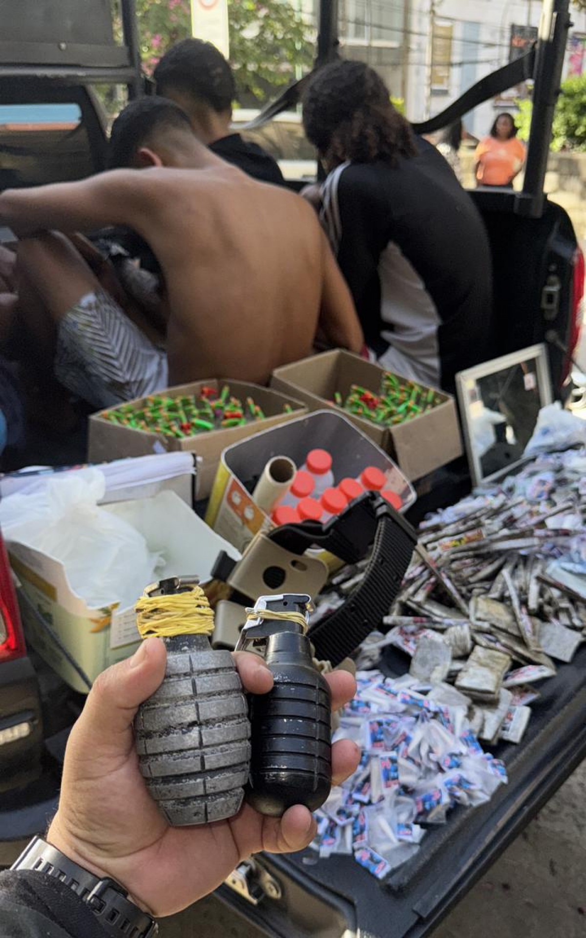 Os policiais apreenderam duas granadas, drogas, celulares e R$ 1.378 em espécie.