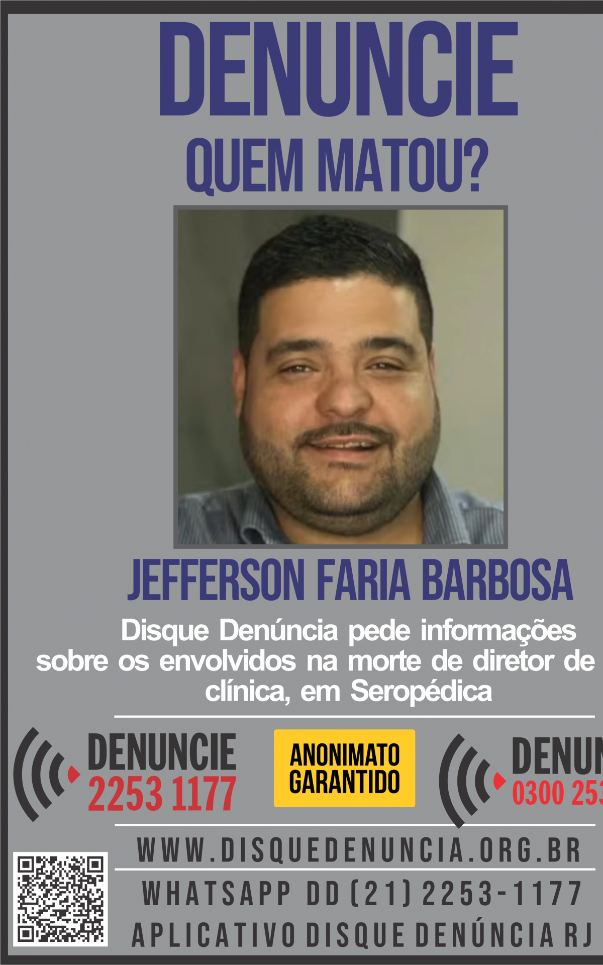 Rio - O Disque Denúncia pede informações sobre os envolvidos na morte do diretor médico geral da Central Médica de Itaguaí (CMI), Jefferson Faria Barbosa, de 38 anos. Neste sábado (17), o serviço divulgou o cartaz para auxiliar nas investigações e no inquérito instaurado pela Delegacia de Homicídios da Baixada Fluminense (DHBF).