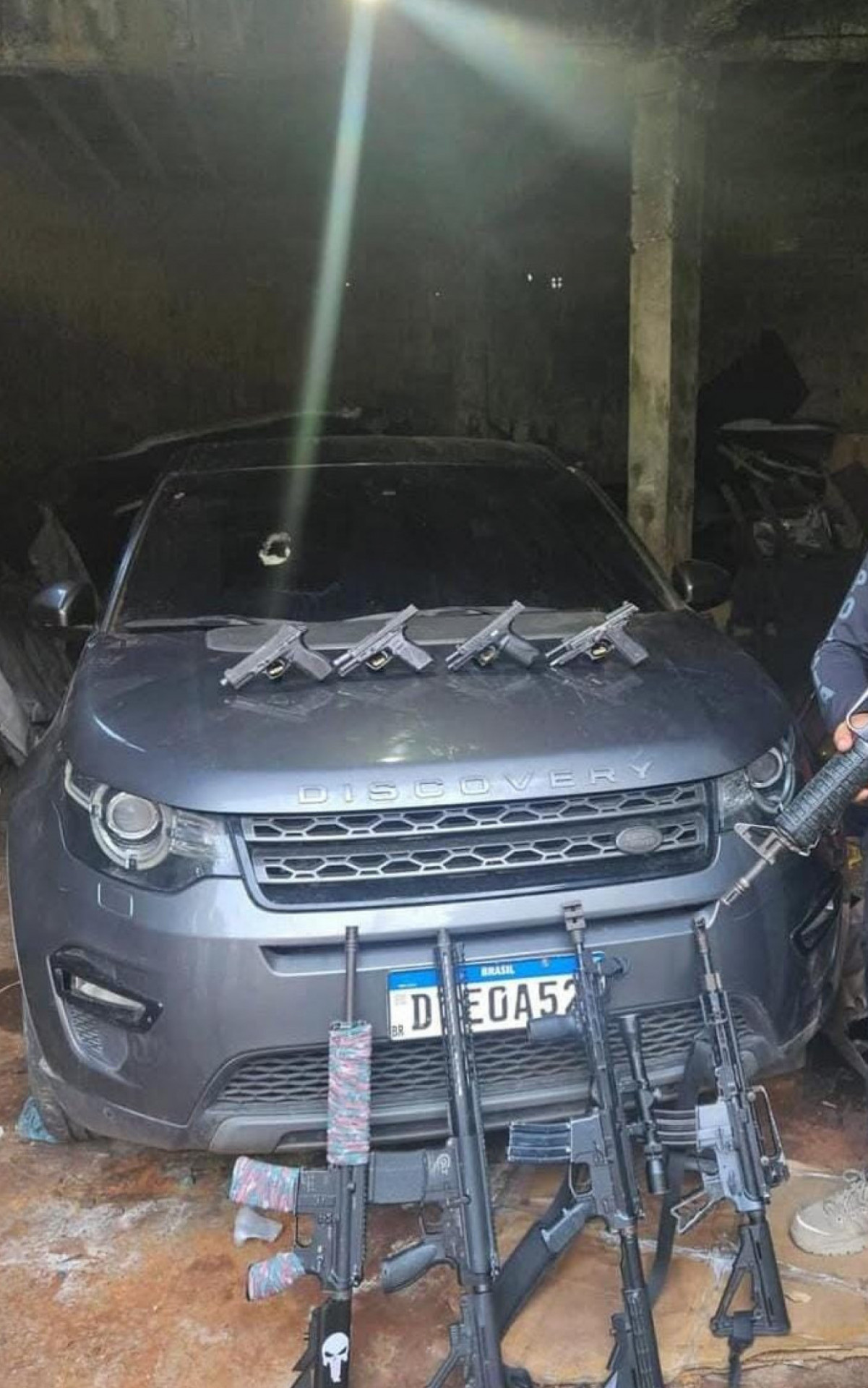 Polícia encontra arsenal do tráfico dentro de veículo blindado em operação no Morro do Dendê.