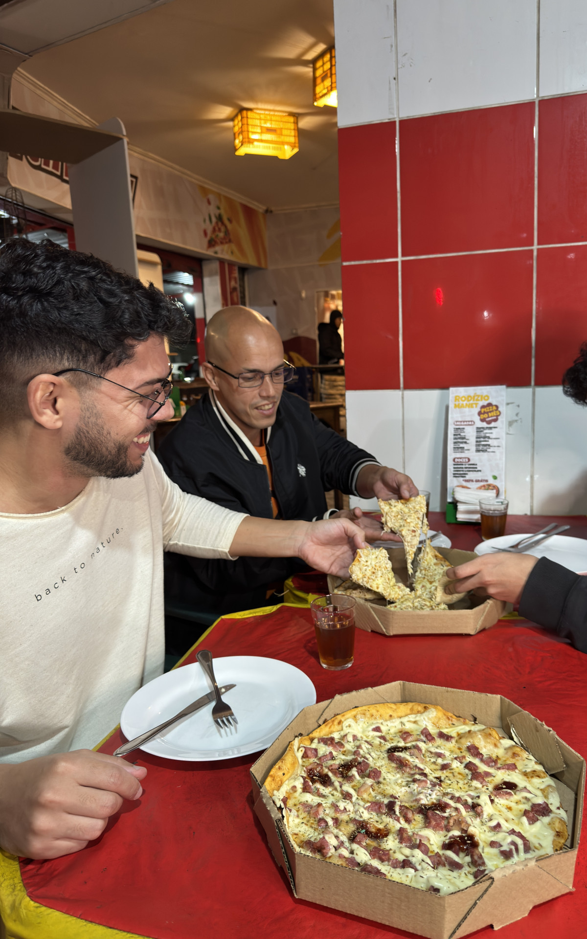 Apaixonados por pizza, os amigos Luiz Eduardo Moraes, Julio Moutinho e Max Real sempre se encontram para saborear a iguaria que nasceu na Itália. Segundo Luiz Eduardo, o mais fissurado e um dos amigos. "O Julio é o amigo mais apaixonado pelas pizzas da Manet Pizza, inclusive, conheci a pizzaria através dele no fim do ano passado e desde então tenho presença garantida toda quarta-feira após o nosso podcast - MDGCast -, que aborda vários assuntos. É certo estarmos lá!", diz Luiz Eduardo que gosta mais da massa fina, pois ela vem caprichada no recheio e não dá aquela sensação de inchaço, a pizza desce leve, é uma combinação maravilhosa. "Eu sou muito fã do frango invertido e da duquesa, essa última é um sabor novo, mas que disparou entre as minhas preferidas da casa. Não sou muito fã de doces, mas se tem uma que caiu nas minhas graças é a banana nevada, a pizza é maravilhosa e super indico, vale muito a pena, principalmente para quem gosta de doce".