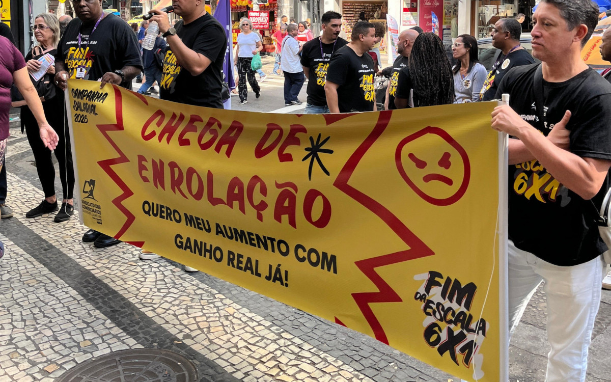 Rio - Trabalhadores do setor de comércio realizaram um ato, nesta quarta-feira (9), em frente a diferentes supermercados do Centro do Rio, pedindo melhorias salariais e o fim da escala 6x1, regime de trabalho em que o empregado trabalha seis dias consecutivos e folga um.