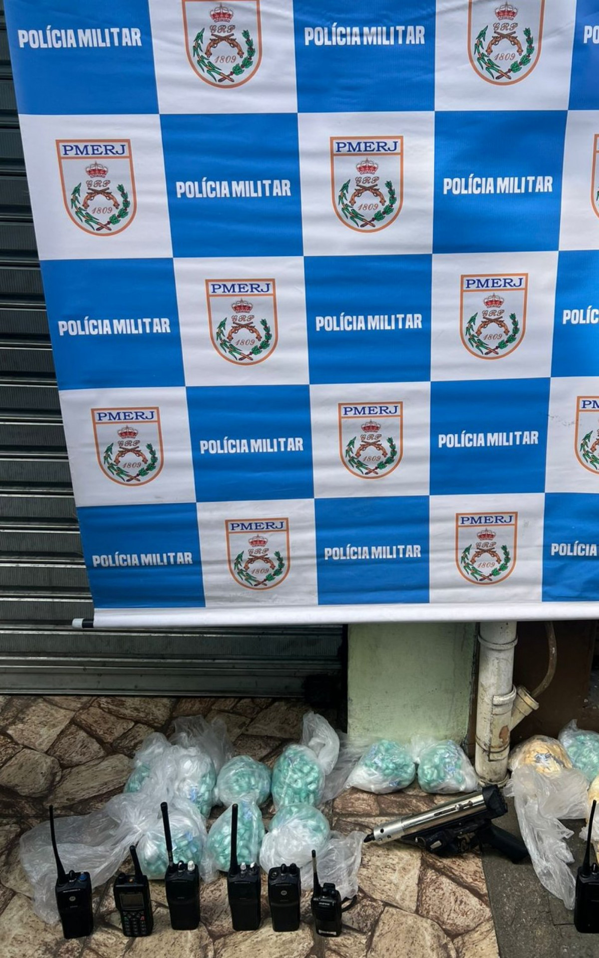 Uma submetralhadora, oito rádios e drogas foram apreendidosReprodução