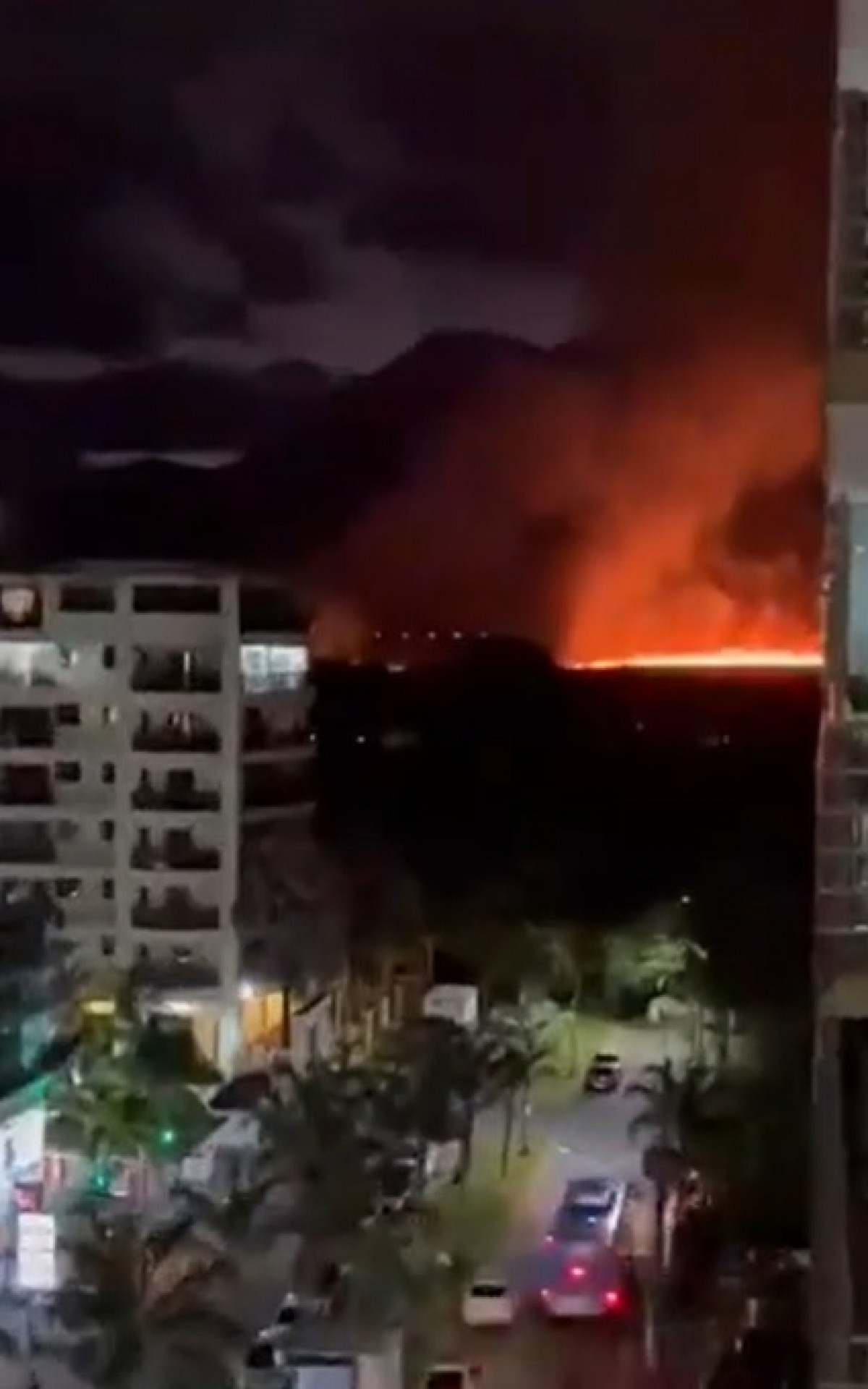 Incêndio de grandes proporções atinge vegetação no Recreio dos Bandeirantes, Zona Oeste do Rio, na noite desta segunda-feira (28).