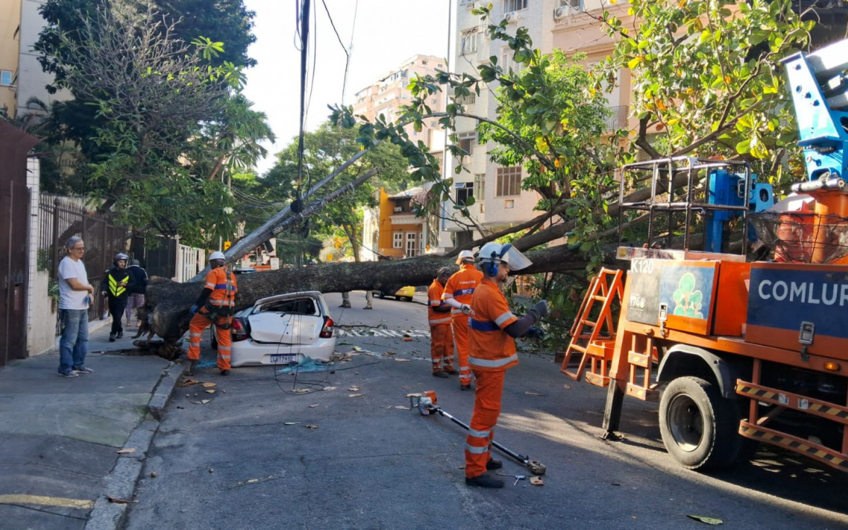 Além do carro, a queda causou estragos na fiação e o fechamento da Rua Esteves Júnior. Equipes da Comlurb atuam no local para fazer a retirada da árvore, que está na transversal da via.