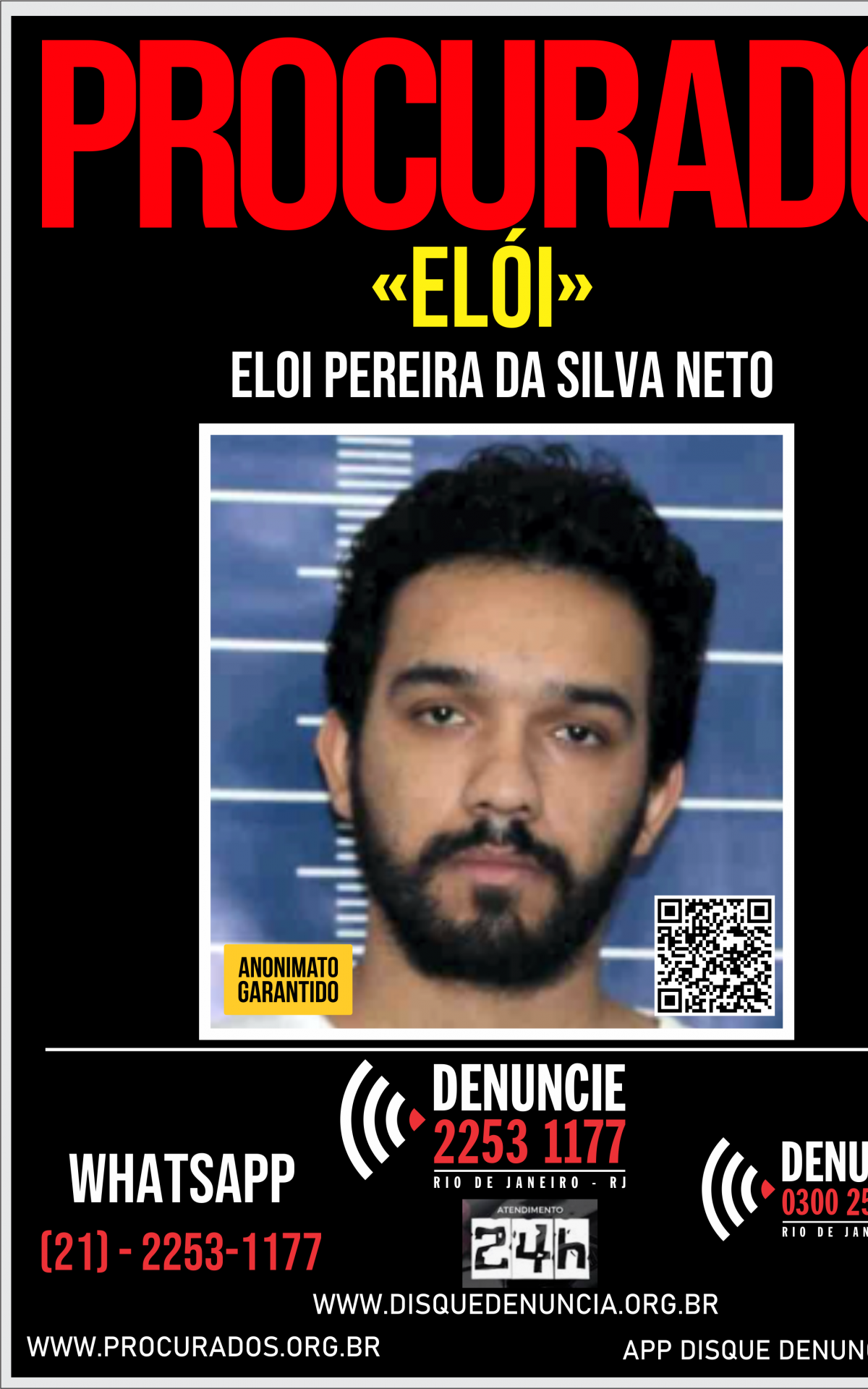 Rio - O Disque Denúncia divulgou, nesta segunda-feira (8), um cartaz de procurados para ajudar nas buscas pelo criminoso Eloi Pereira da Silva Neto, de 32 anos, acusado de aplicar um golpe milionário em uma idosa de 77 anos, que teve um prejuízo estimado em mais de R$ 300 mil.