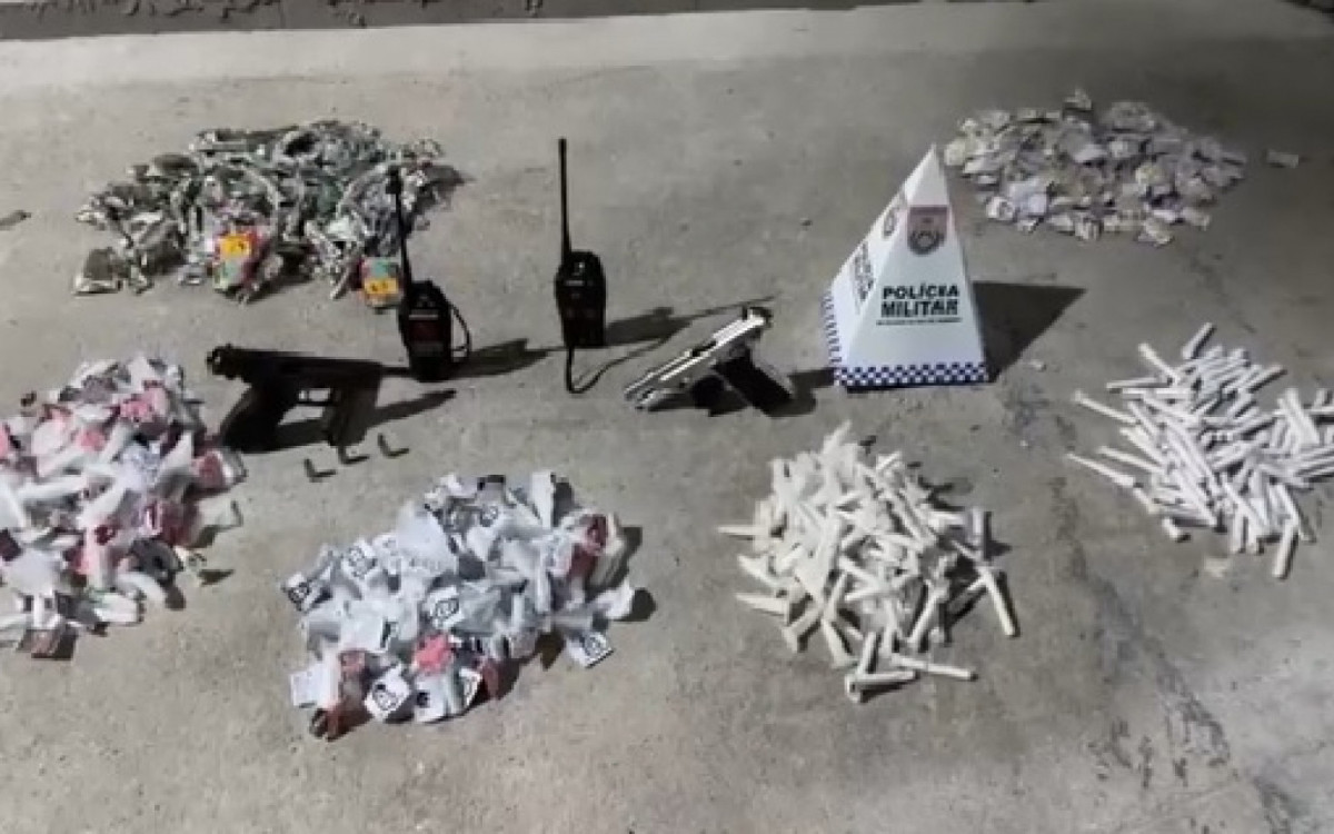 Policiais apreenderam duas pistolas, munições, grande quantidade de drogas e radiotransmissoresDivulgação/Polícia Militar