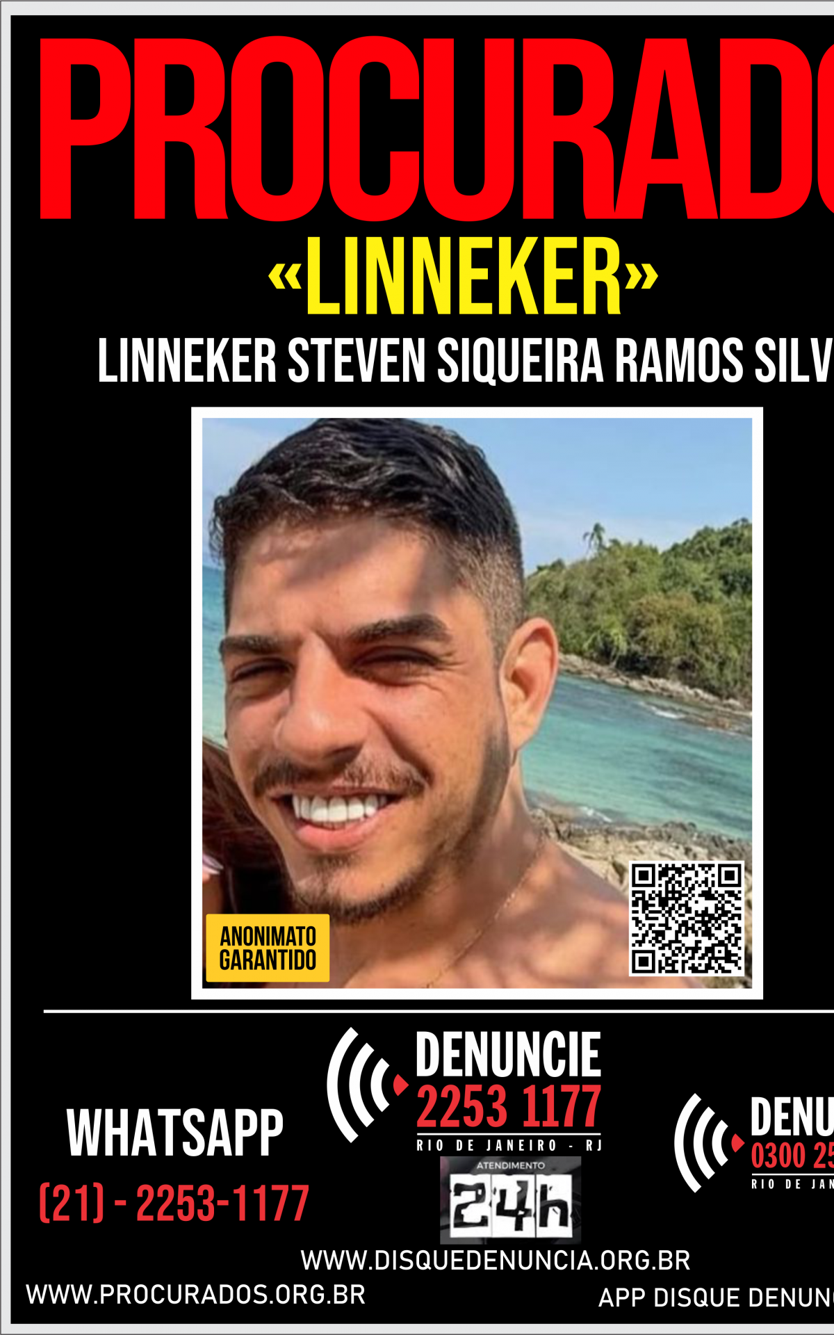 Qualquer informação sobre o paradeiro do suspeito pode ser enviada, de forma anônima, ao Disque Denúncia, através dos canais de atendimento: