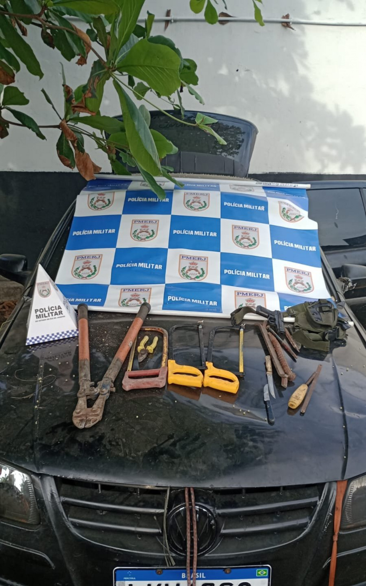 De acordo com a PM, dentro do carro havia uma réplica de arma de fogo, dois alicates, duas facas, três arcos de serra, fios e uma chave de fenda.
