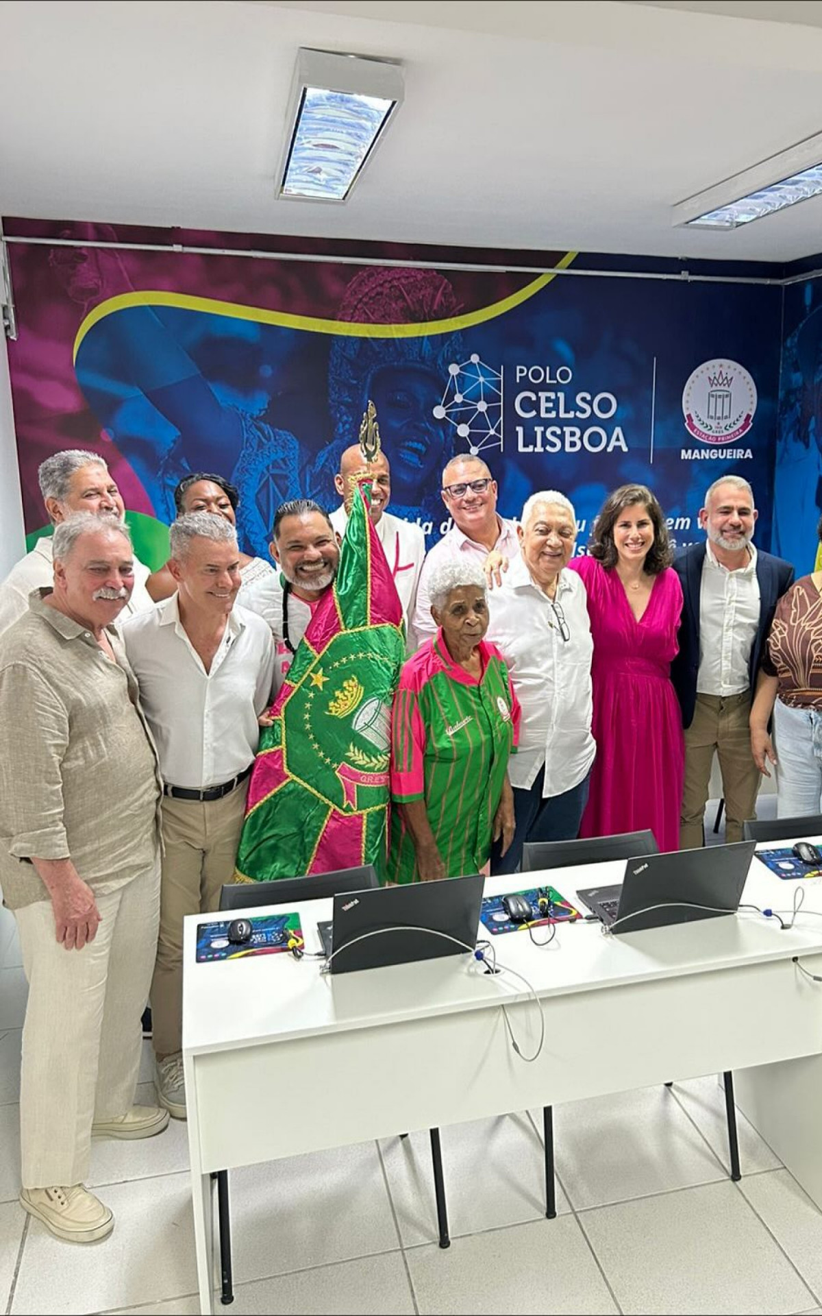 Membros da diretoria da Mangueira e da Celso Lisboa posam na sala do novo polo educacionalDivulgação