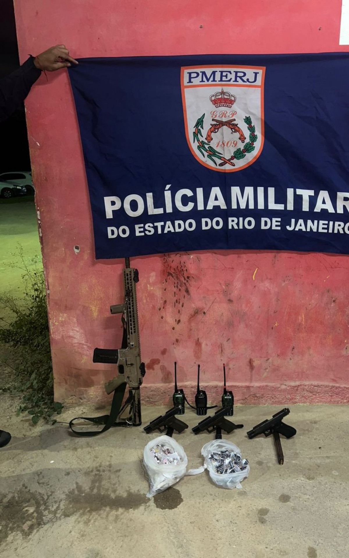 Com os criminosos, foram apreendidos um fuzil, três pistolas, além de embalagens com drogas e rádios comunicadores