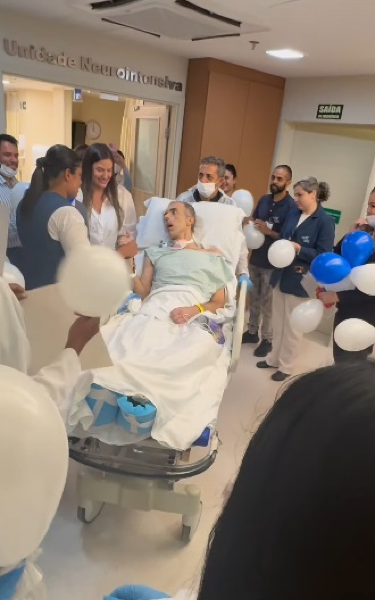 A mulher do policial tem compartilhado a evolução do quadro do marido em um perfil nas redes sociais. Em uma publicação nesta segunda-feira, o comandante aparece deixando o CTI em uma cama hospitalar, enquanto é aplaudido pelos profissionais do hospital, que também seguram balões e cartazes. Confira abaixo. "Recebemos a tão sonhada alta do CTI e seguimos para o quarto do hospital", escreveu Keidna Marques.