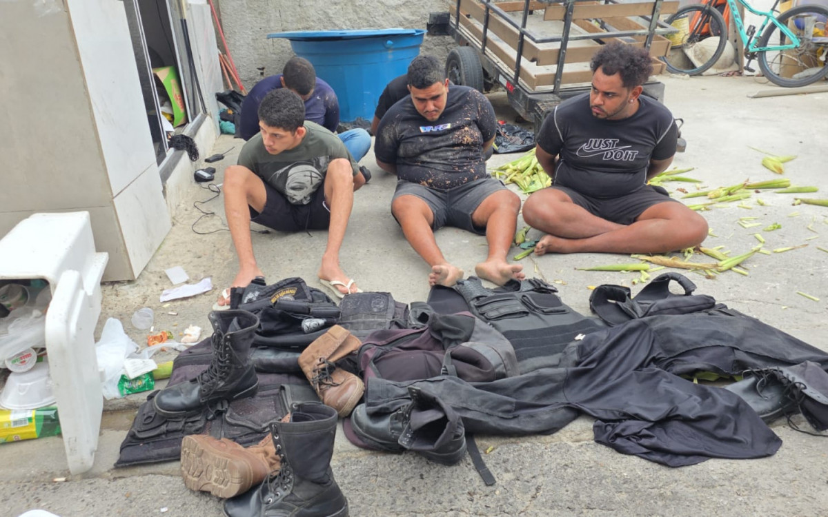 No endereço, os policiais encontraram um imóvel usado como base do grupo, com esconderijos improvisados na parede. Foram apreendidos carregadores de fuzil com munição, capas de coletes, fardamentos, uma granada e dois veículos roubados.