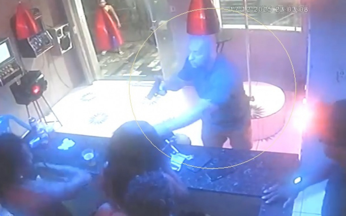Imagens registradas por uma câmera de segurança mostram o policial entrando em um bar e cumprimentando um homem. Em seguida, ele saca uma arma e passa a ameaçar as vítimas, que são empurradas para trás do balcão do estabelecimento. No vídeo, ainda é possível ver o militar mexendo em bolsas e pegando celulares das vítimas.