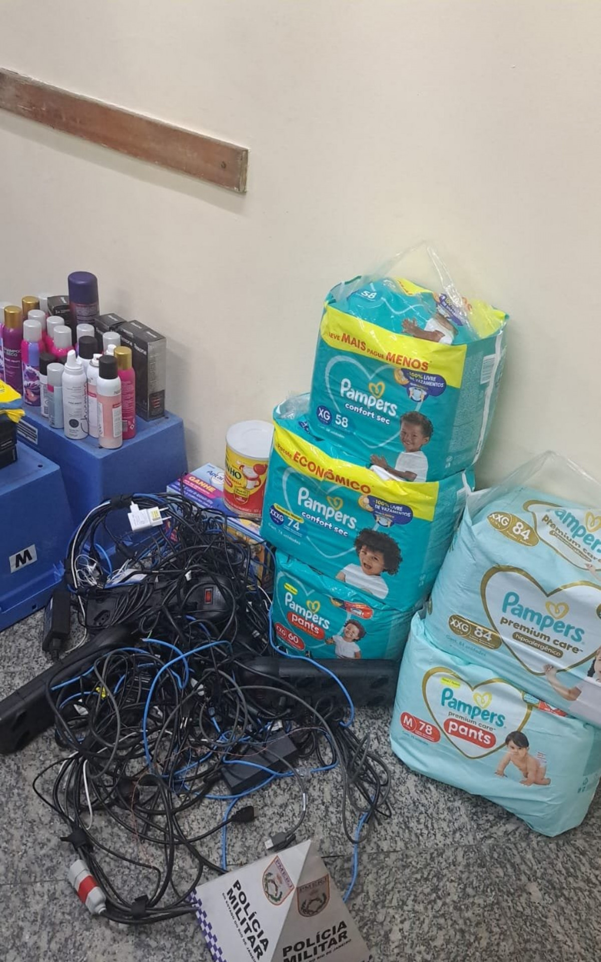 Com a dupla, que não teve a identidade divulgada, os militares apreenderam uma faca, um cutelo, um pé de cabra usado no arrombamento, e os itens roubados, entre eles fraldas, leite em pó, e diversos produtos cosméticos.