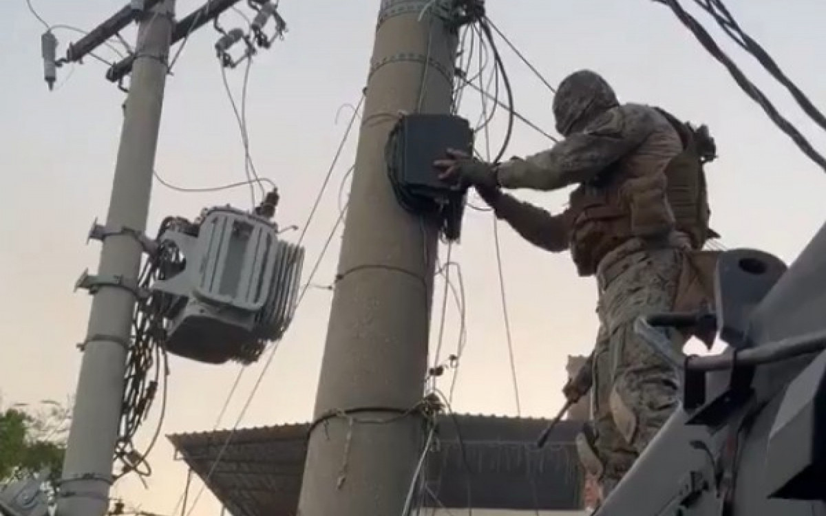 Imagens divulgadas pela corporação mostram um policial, em cima de um veículo blindado, retirando de um poste os equipamentos montados por criminosos.