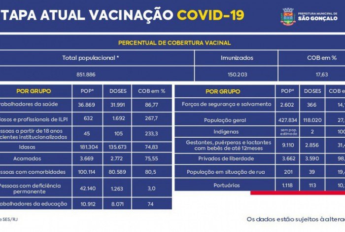 Além da população em geral, São Gonçalo continua vacinando portuários, trabalhadores da educação, profissionais de educação física, guardas municipais e veterinários, todos em atividade e com vínculo empregatício ou residencial com São Gonçalo; grávidas, puérperas e lactantes com bebês de até 12 meses sem comorbidades com autorização médica; estagiários da saúde atuando em unidade hospitalar; pessoas com comorbidades, doenças neurológicas crônicas, deficiência permanente ou síndrome de Down; trabalhadores da saúde da linha de frente e profissionais da área biomédica - todos estes acima dos 18 anos.