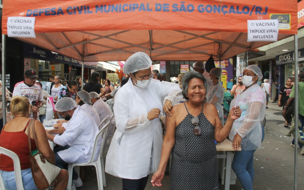 São Gonçalo - Quem passou pela Rua Yolanda Saad Abuzaid (popular Calçadão de Alcântara), nesta quarta-feira (28), pôde se vacinar com as vacinas Tríplice Viral (sarampo, caxumba e rubéola) e Influenza (gripe). A vacinação fora das unidades de saúde faz parte da ação de bloqueio contra o sarampo e de aumento dos índices de vacinação em São Gonçalo. Até as 12h, 378 doses das vacinas foram aplicadas.