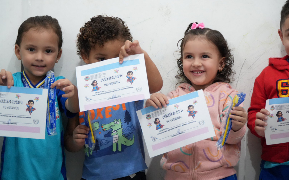 As crianças de 2 a 4 anos participaram das atividades por grupos. Ao todo, 134 estudantes iam passar pelas brincadeiras lúdicas, que misturam diversão e aprendizado. Todas as crianças que participaram ganharam certificado de coragem, escova dental e kit de colorir.