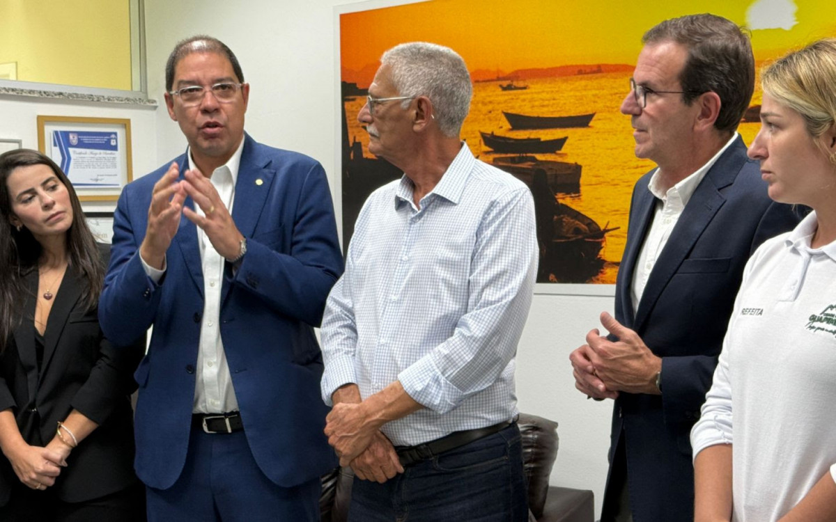 São Gonçalo - Em uma iniciativa histórica para São Gonçalo, o prefeito Capitão Nelson recebeu em seu gabinete, nesta terça-feira (2), os prefeitos do Rio de Janeiro, Eduardo Paes, e de Maricá, Washington Quaquá, para a assinatura de um acordo judicial interfederativo, que inclui os municípios de Magé e Guapimirim, envolvendo a distribuição dos royalties de petróleo para as cidades do Leste Fluminense. A prefeita de Guapimirim, Marina Rocha, e a vice-prefeita de Magé, Jamille Cozzolino, também estiveram presentes.