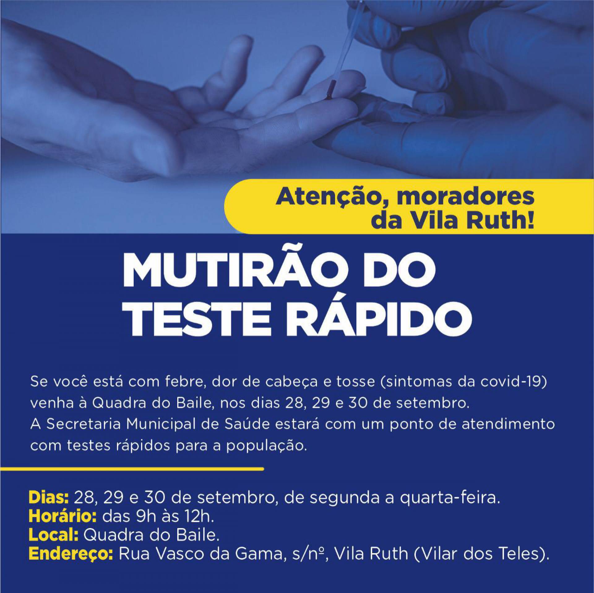 A Prefeitura de São João de Meriti, por meio da Secretaria Municipal de Saúde, realizará nos dias 28, 29 e 30 de setembro, das 9h às 12h, o décimo quinto Mutirão de Testes Rápidos para prevenção da Covid-19 no município. Desta vez, a ação acontece na Quadra do Baile da Vila Ruth, em Vilar dos Teles.