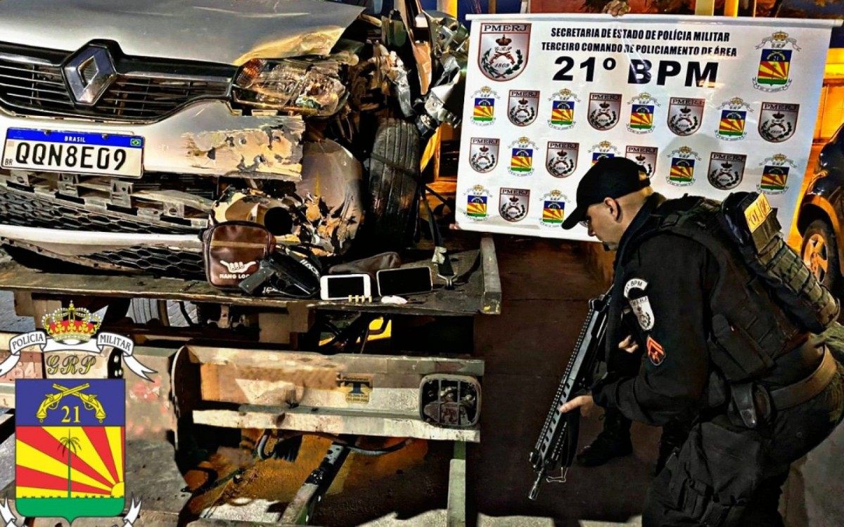 Durante a perseguição, os criminosos tentaram fugir para a comunidade do Carrapato, efetuando disparos de fogo na direção da viatura. Na altura da Avenida Automóvel Clube, os indivíduos perderam o controle do veículo e bateram. Um dos suspeitos conseguiu fugir para o interior da comunidade.