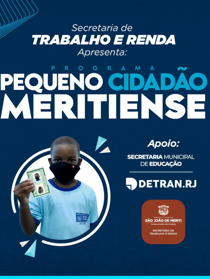 A Secretaria de Trabalho e Renda em parceria com a Secretaria de Educação da Prefeitura de São João de Meriti realiza, entre 26 e 29 de abril, o programa Pequeno Cidadão Meritiense, no Ciep 180 João Goulart na Rua Dois, bairro Parque Juriti.