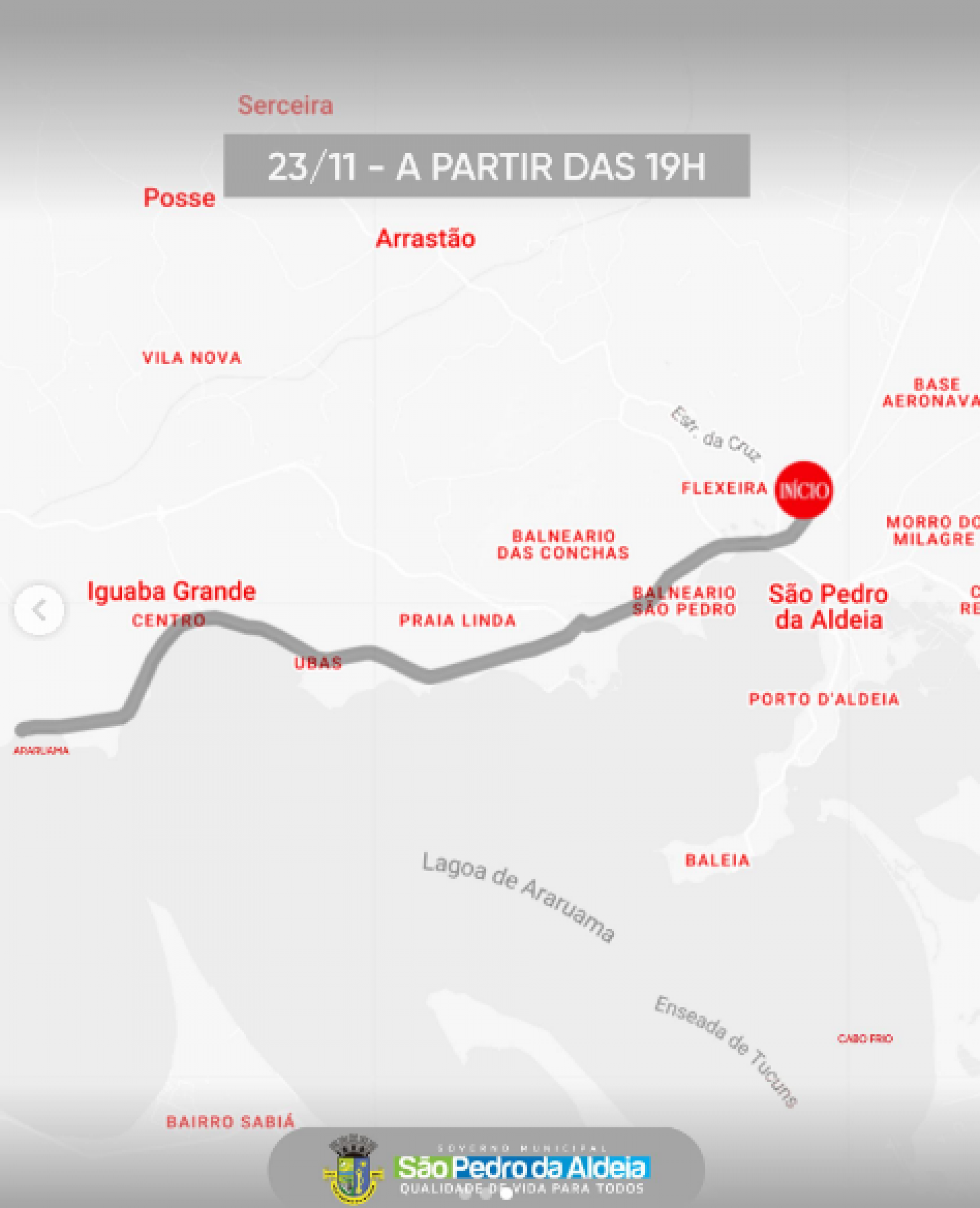 No sábado (23), a caravana sairá do bairro Jardim Morada da Aldeia, com partida da fábrica Andina, às 19h, e seguirá pela Rodovia RJ-106 em direção a Iguaba Grande.