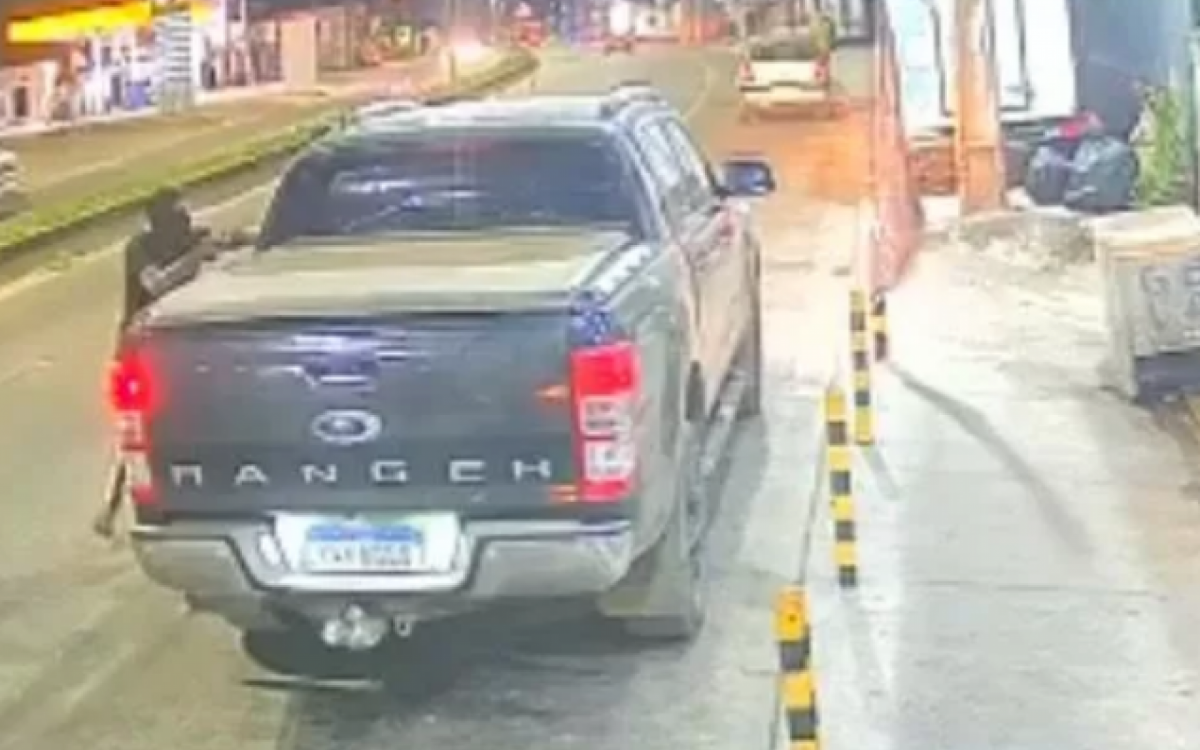 O criminoso desce da moto encapuzado e mantém a arma apontada para o homem durante a ação. A vítima não reage e entrega a chave do veículo. Em seguida, o criminoso entra na caminhonete, enquanto o comparsa foge na moto.