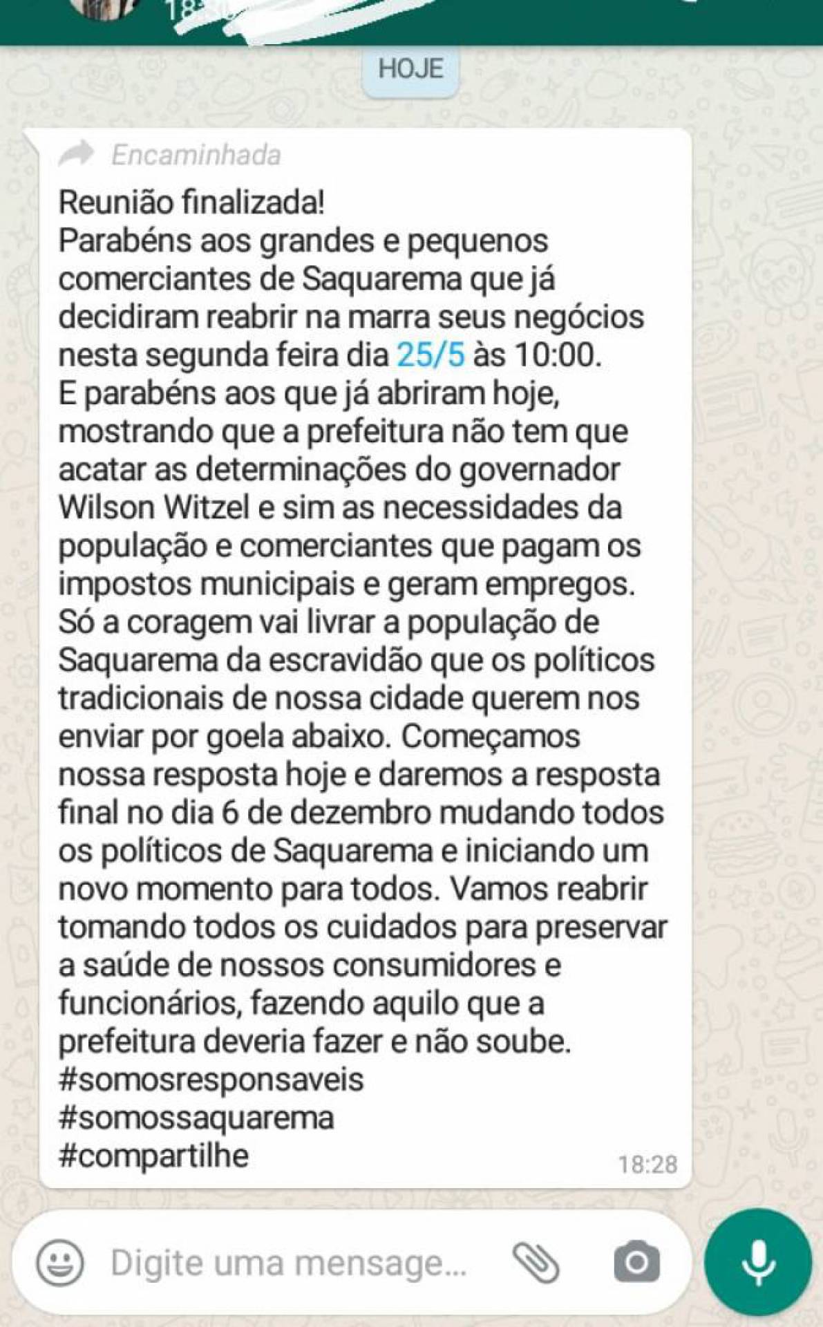 Na mensagem ‘fake’, a informação foi de que uma reunião teria sido finalizada naquele momento (em que a mensagem foi enviada) e parabeniza os grandes e pequenos empresários de Saquarema, que já teriam decidido reabrir ‘na marra’ seus negócios, nesta segunda-feira (25). Parabeniza também os que já teriam reaberto nesse domingo e diz que a prefeitura não tem que acatar as determinações do governador Wilson Witzel e sim as necessidades da população e comerciantes que pagam os impostos municipais e geram empregos.