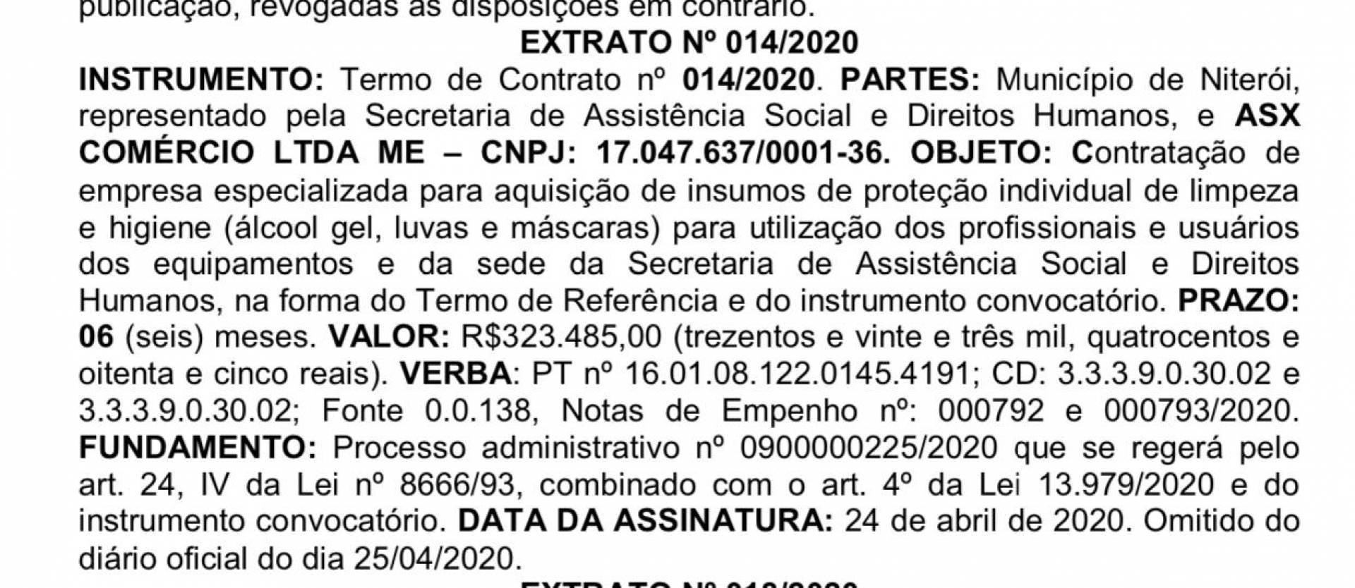 O DIA constatou que desde o dia 24 de abril, a papelaria ASX fornece EPI's (Equipamentos de Proteção Individual), como máscaras, álcool em gel e luvas à Secretaria de Assistência Social de Niterói. O contrato de compra, válido por 6 meses, é de mais de R$323.000,00, conforme informações do Diário Oficial de Niterói.