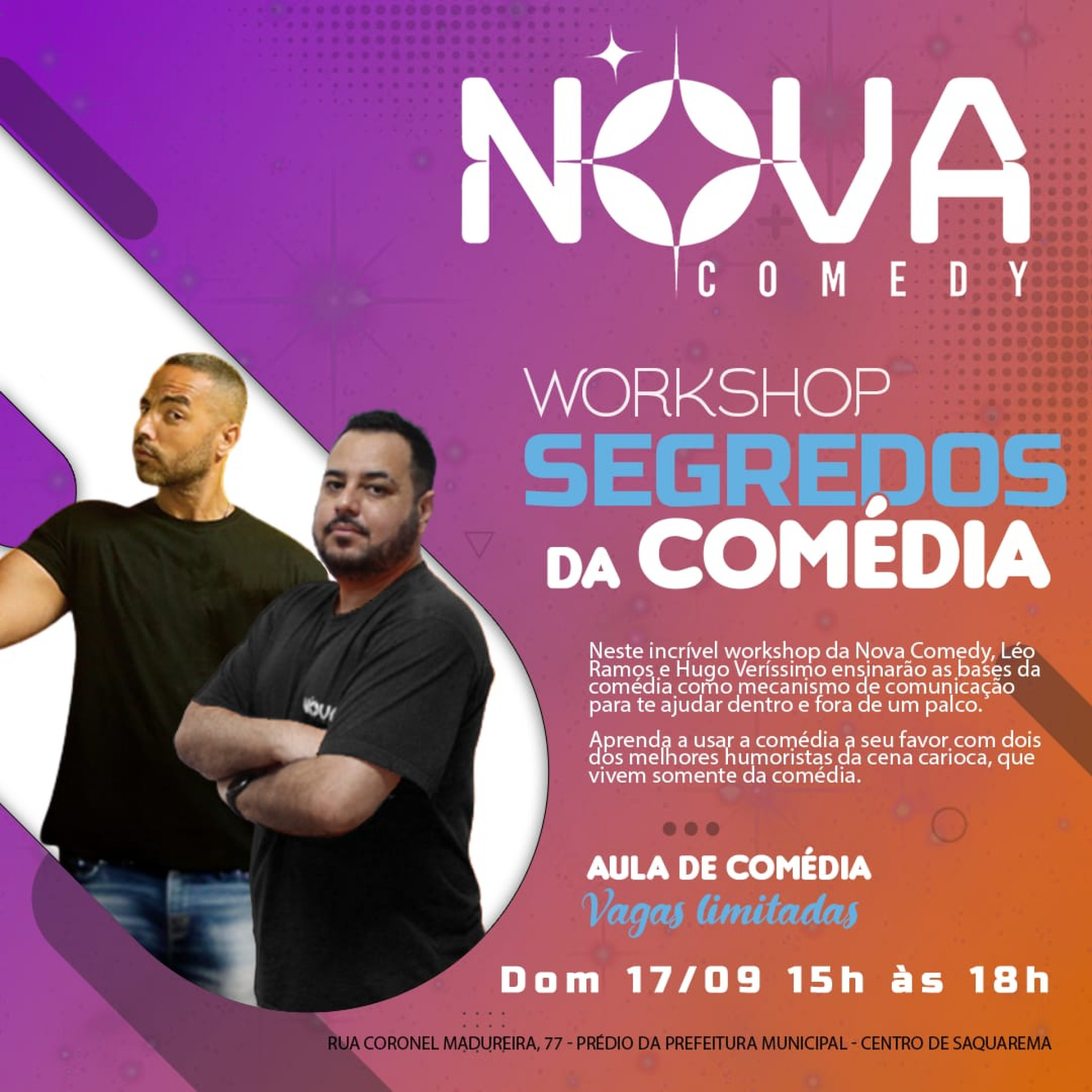 Também no domingo (17), às 15h e às 18h, o Teatro Mário Lago recebe o workshop “Segredos da Comédia”, produzido pela Nova Comedy. Nele, Léo Ramos e Hugo Veríssimo ensinarão as bases da comédia como mecanismo de comunicação para ser usado dentro e fora do palco. A produção é da Nova Comedy - Escola de Comédia. A aula de comédia tem vagas limitadas e os ingressos podem ser adquiridos no Sympla, pelo link, por R$ 199,90.