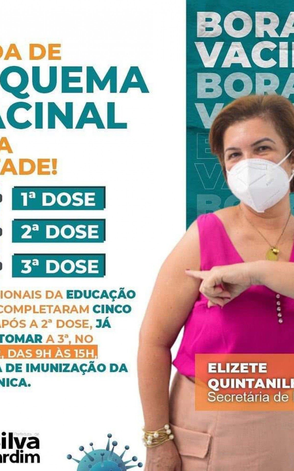 Silva Jardim - A Prefeitura Municipal de Silva Jardim, através da secretaria de saúde informa que de acordo com as normas do Plano Nacional de Imunização, quem já completou CINCO meses após a aplicação da segunda dose - ou dose única - já está liberado para tomar a terceira dose.