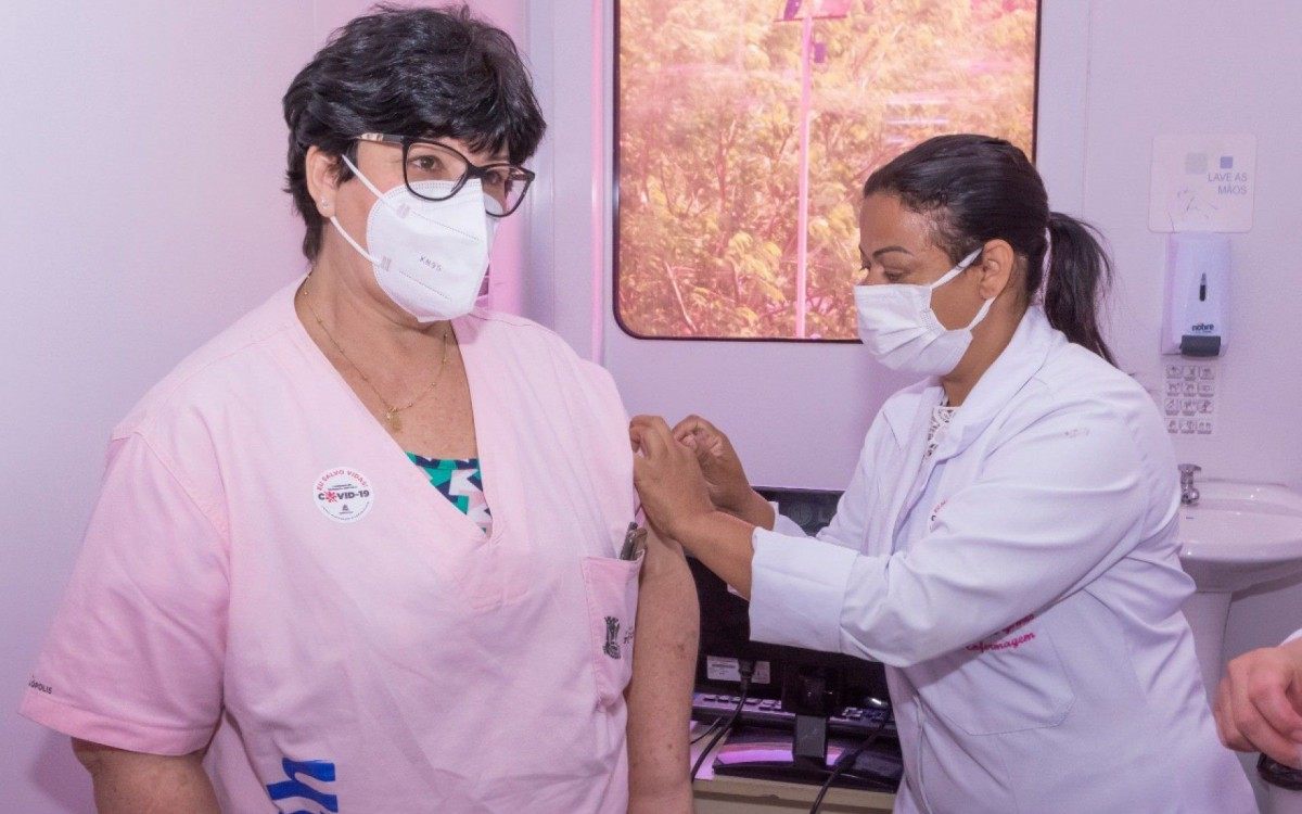 Os trabalhadores da saúde que tomaram a vacina em seu local de trabalho receberão a segunda dose no mesmo local. Esses profissionais devem aguardar o comunicado da direção de sua unidade de saúde sobre a data da imunização.