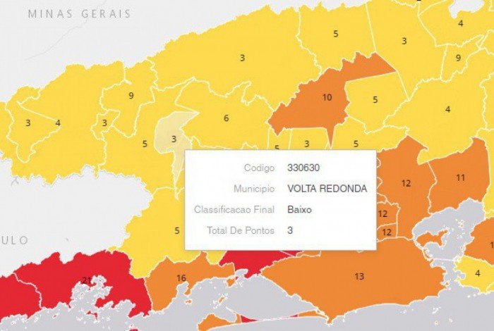 Volta Redonda - A última edição do Mapa de Risco da Covid-19 divulgada pela Secretaria de Estado de Saúde (SES) mostra que Volta Redonda está na bandeira amarela (risco baixo de contrair a doença). A região Médio Paraíba, a qual o município pertence, também está na bandeira amarela.