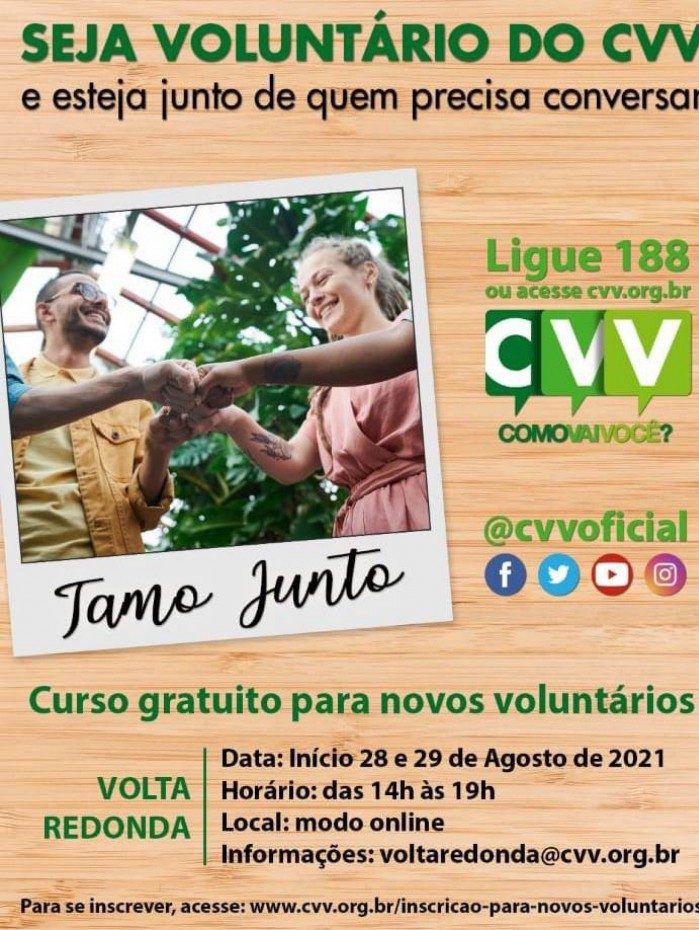 Volta Redonda - O Centro de Valorização da Vida (CVV) está com vagas abertas para novos voluntários em Volta Redonda. Os interessados podem se inscrever até 3 horas antes do início do curso que acontecerá no modo online, nos dias 28 e 29 de agosto, no horário entre 14h e 19h.