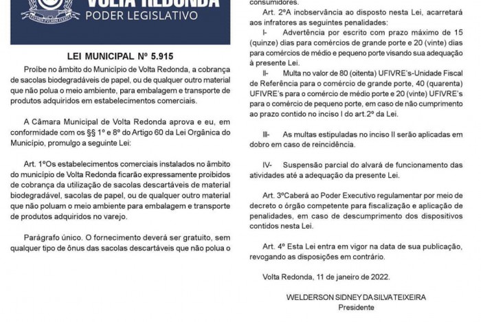 Volta Redonda - A Câmara Municipal de Volta Redonda publicou a Lei 5.915 que estabelece a proibição da “cobrança de sacolas biodegradáveis de papel, ou de qualquer outro material que não polua o meio ambiente, para embalagem e transporte de produtos adquiridos em estabelecimentos comerciais”.
