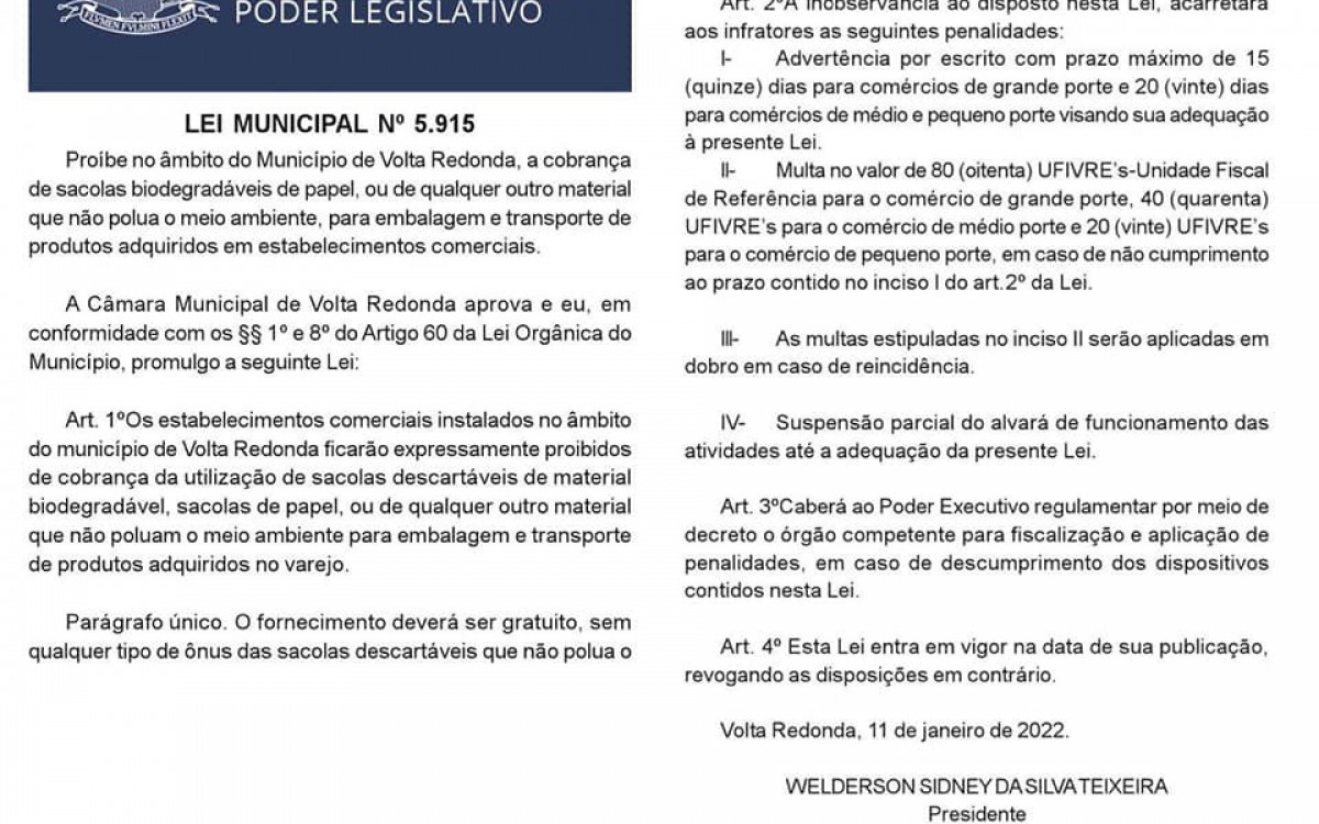 Volta Redonda - A Câmara Municipal de Volta Redonda publicou a Lei 5.915 que estabelece a proibição da “cobrança de sacolas biodegradáveis de papel, ou de qualquer outro material que não polua o meio ambiente, para embalagem e transporte de produtos adquiridos em estabelecimentos comerciais”.